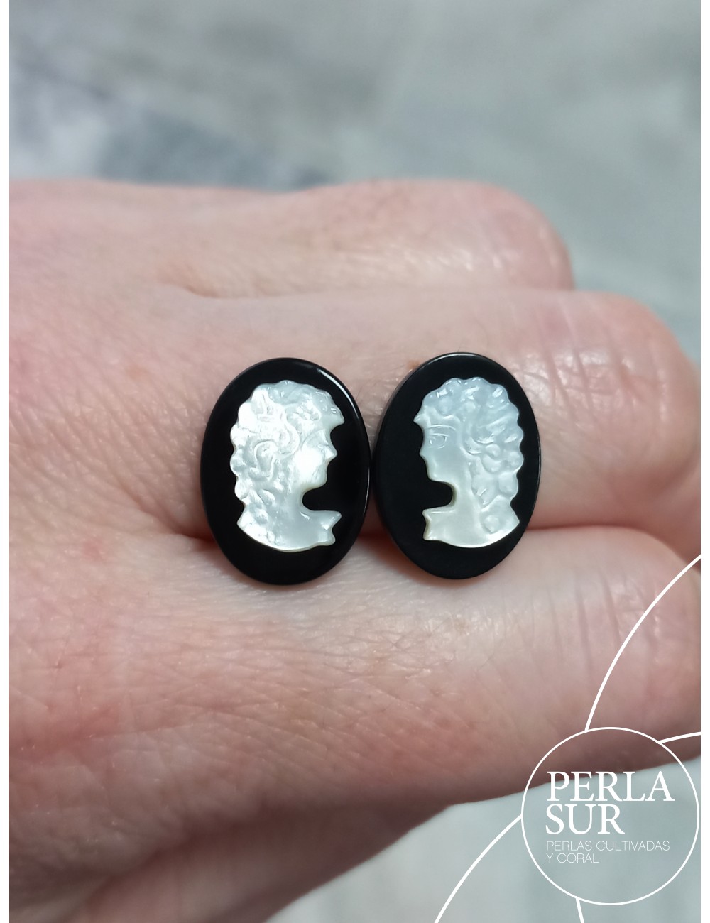 Camafeos tallados a mano en concha de ostra de perla Australiana (especie Pinctada Máxima) nácar y disco de gema ónix 12x16mm. El Ónix es una piedra preciosa de la variedad del ágata o Calcedonia, del grupo mineral del Cuarzo.