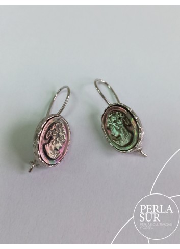 Pendientes de camafeo de concha de ostra Pinctada Margaritifera con palillo hippie colgante de plata 925.