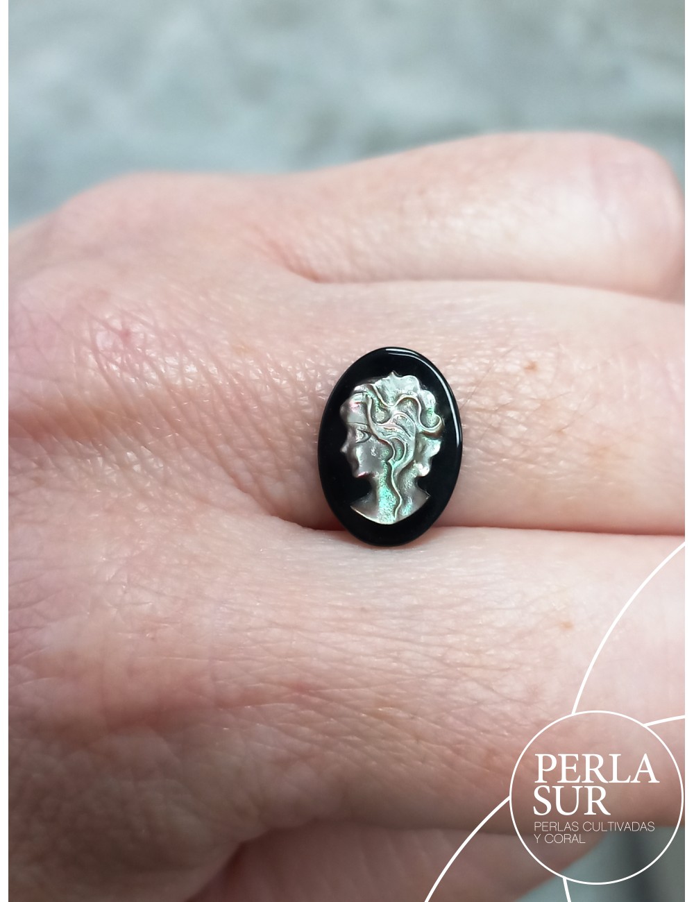 Camafeo tallado a mano en concha de ostra de perla de Tahití (especie Pinctada Margaritifera) nácar natural y disco de gema ónix. El Ónix es una piedra preciosa de la variedad del ágata o Calcedonia, del grupo mineral del Cuarzo.