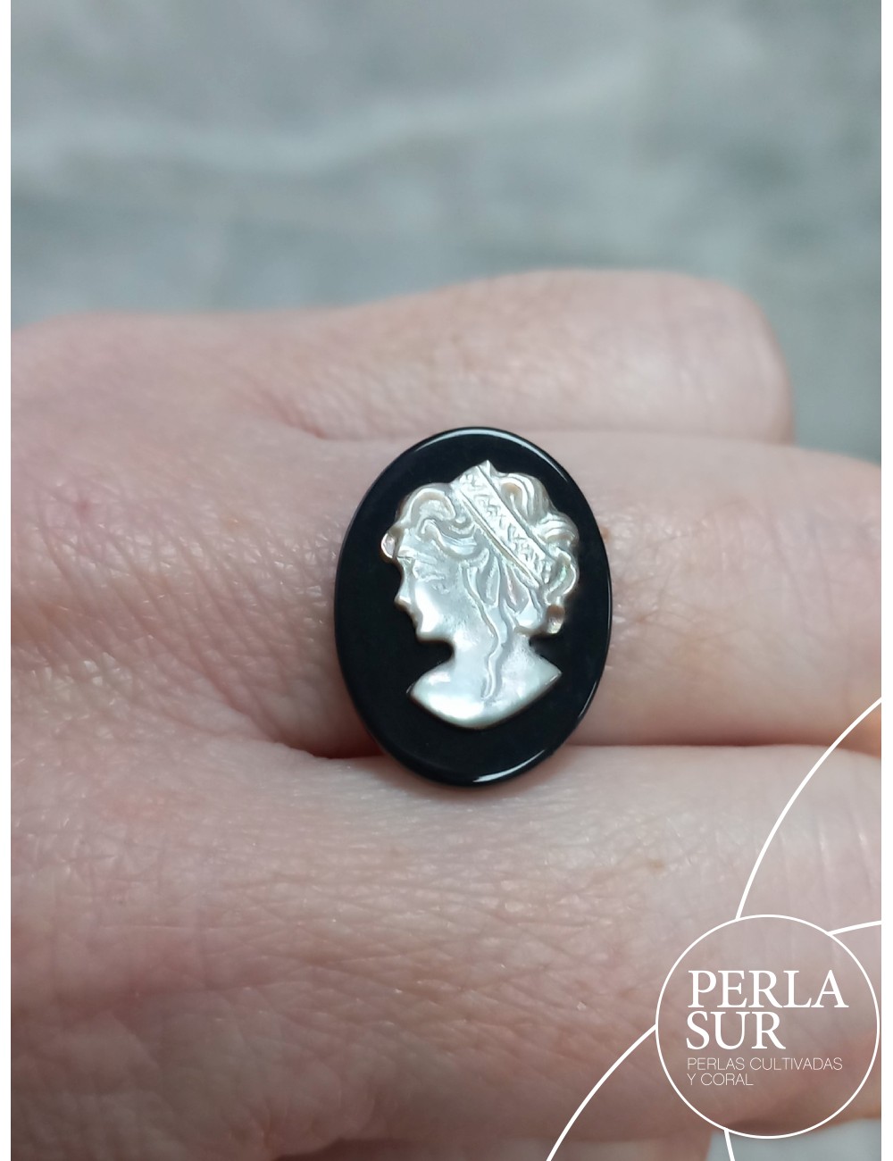 Camafeo tallado a mano en concha de ostra de perla de Tahití (especie Pinctada Margaritifera) nácar natural y disco de gema ónix. El Ónix es una piedra preciosa de la variedad del ágata o Calcedonia, del grupo mineral del Cuarzo.