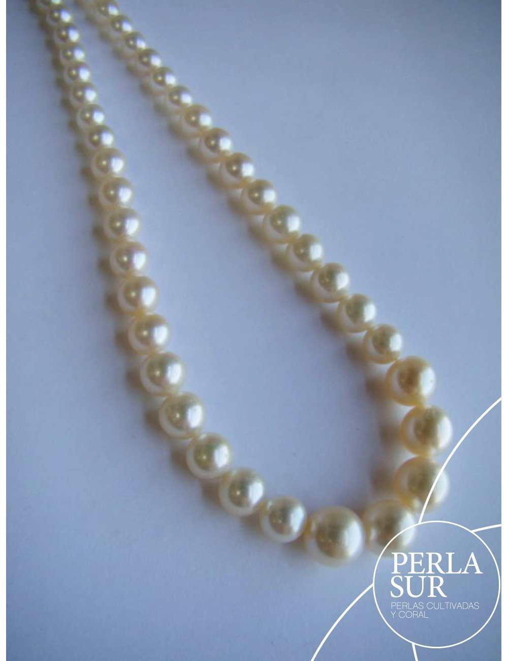 Hilo de perla Akoya redonda, cultivada en la ostra Pinctada Martensii. Mide 35 cm de longitud y tiene 51 perlas en diferentes tamaños de menor a mayor.