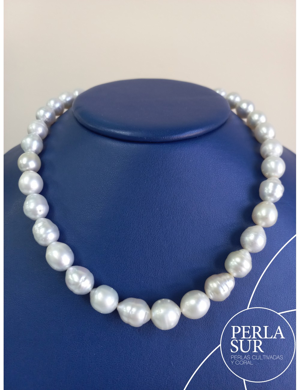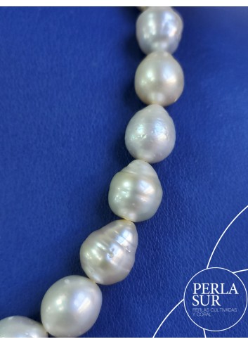 Hilo de perlas cultivadas en la ostra Pinctada Máxima. Perlas de forma barroca tono blanco.