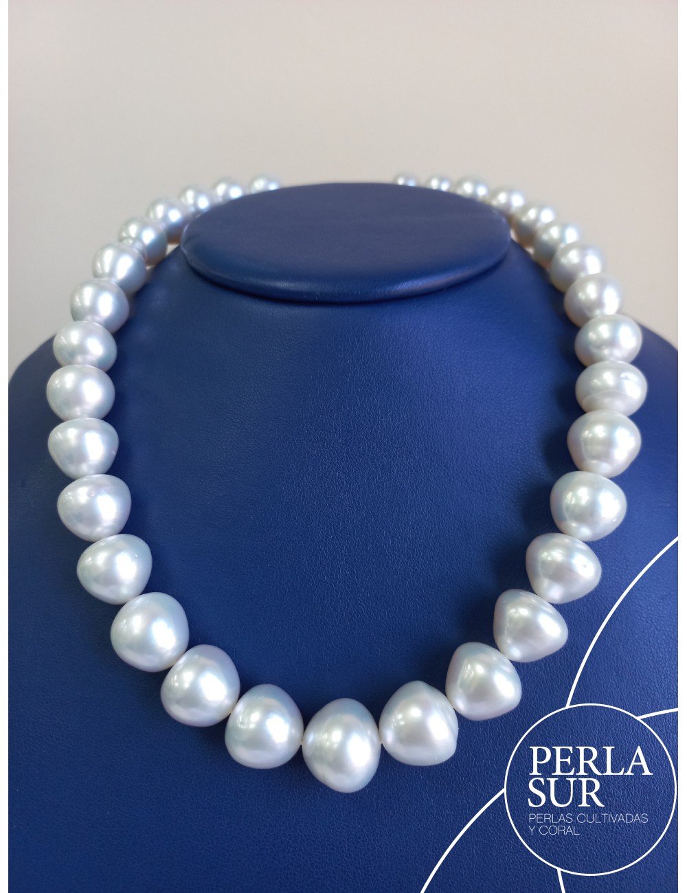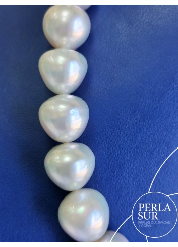 Hilo de Perlas Barrocas Australianas. Perlas cultivadas en la ostra Pinctada Máxima. El hilo se compone de 33 perlas en disminución, desde 11´30 a 16´30mm de diámetro. Mide 43 cm de longitud. Cierre no incluido.