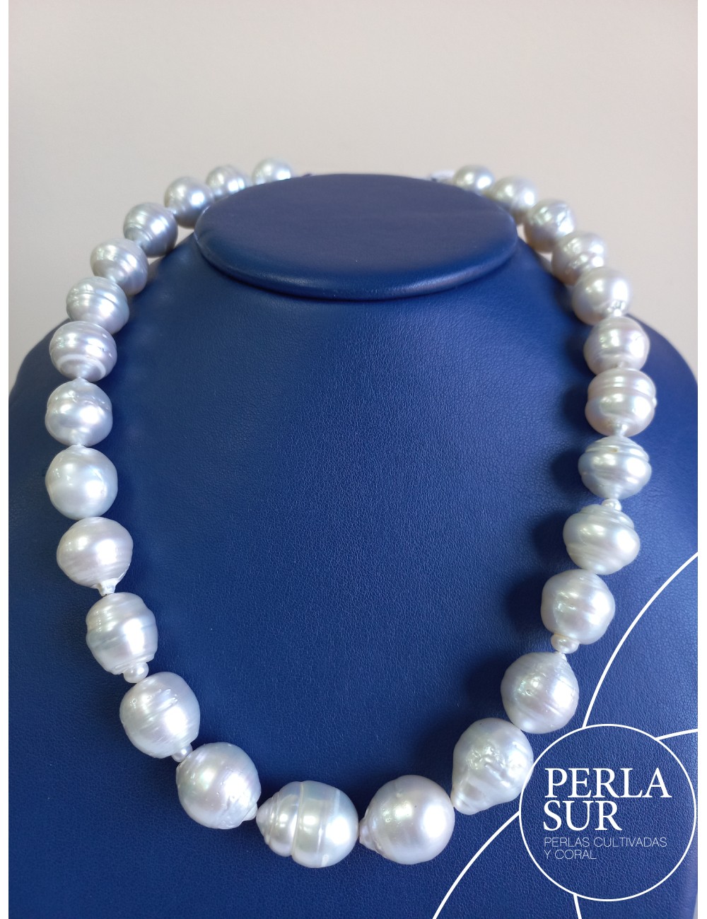 Hilo de Perlas Australianas Barrocas. Perlas cultivadas en la ostra Pinctada Máxima. Está compuesto por 27 perlas en ligera disminución, desde 13 a 15mm de diámetro. Mide 45cm de longitud. Cierre no incluido.