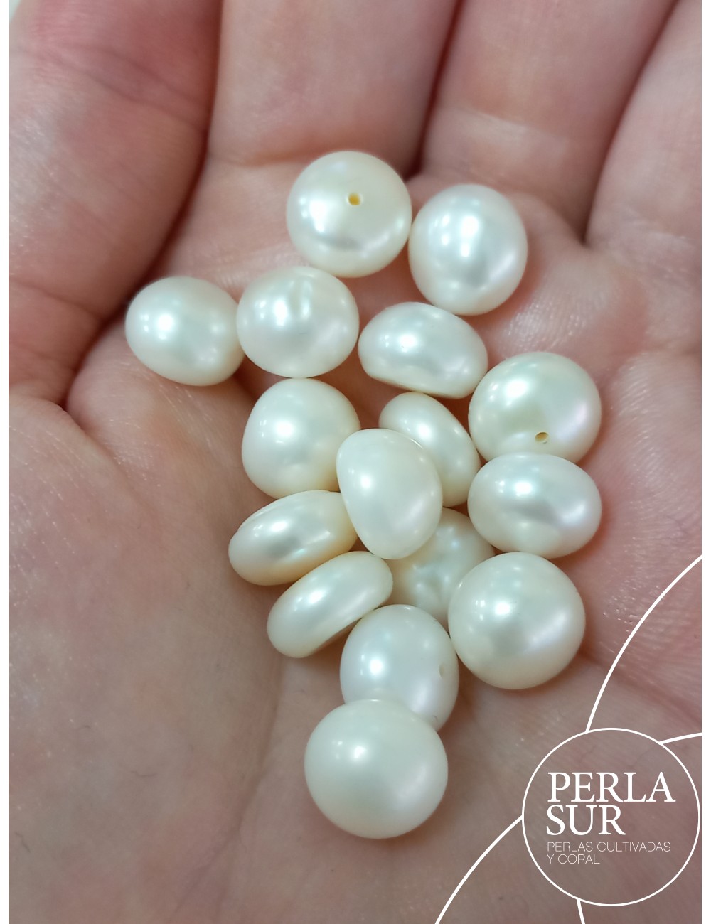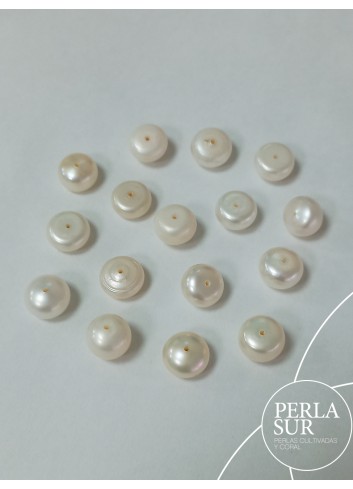Perla cultivada agua dulce con forma de botón. Tienen un medio taladro en la base. Precio por unidad. No hacen pareja.