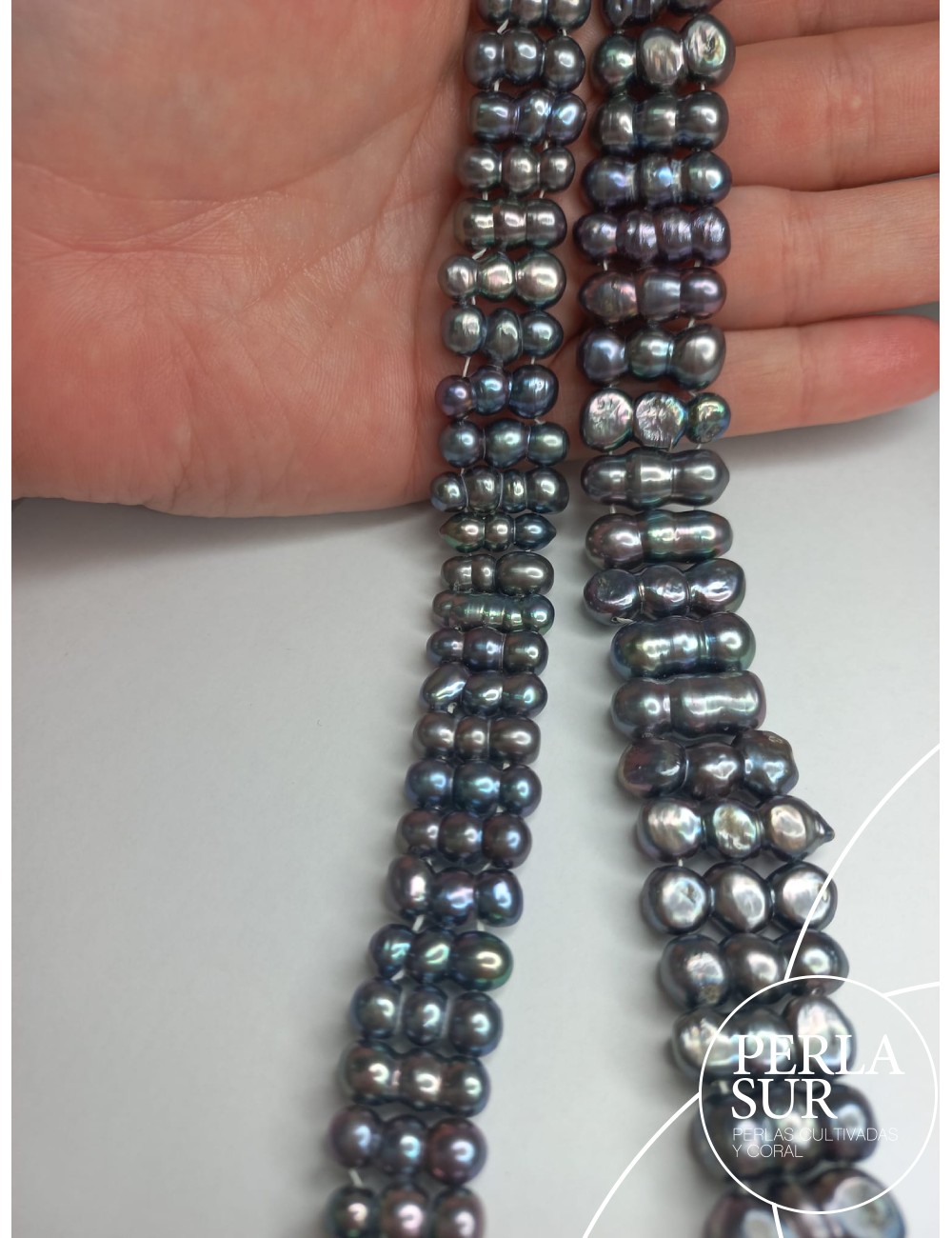 Están atravesadas a lo ancho, por lo que pasan tres hilos por cada perla.