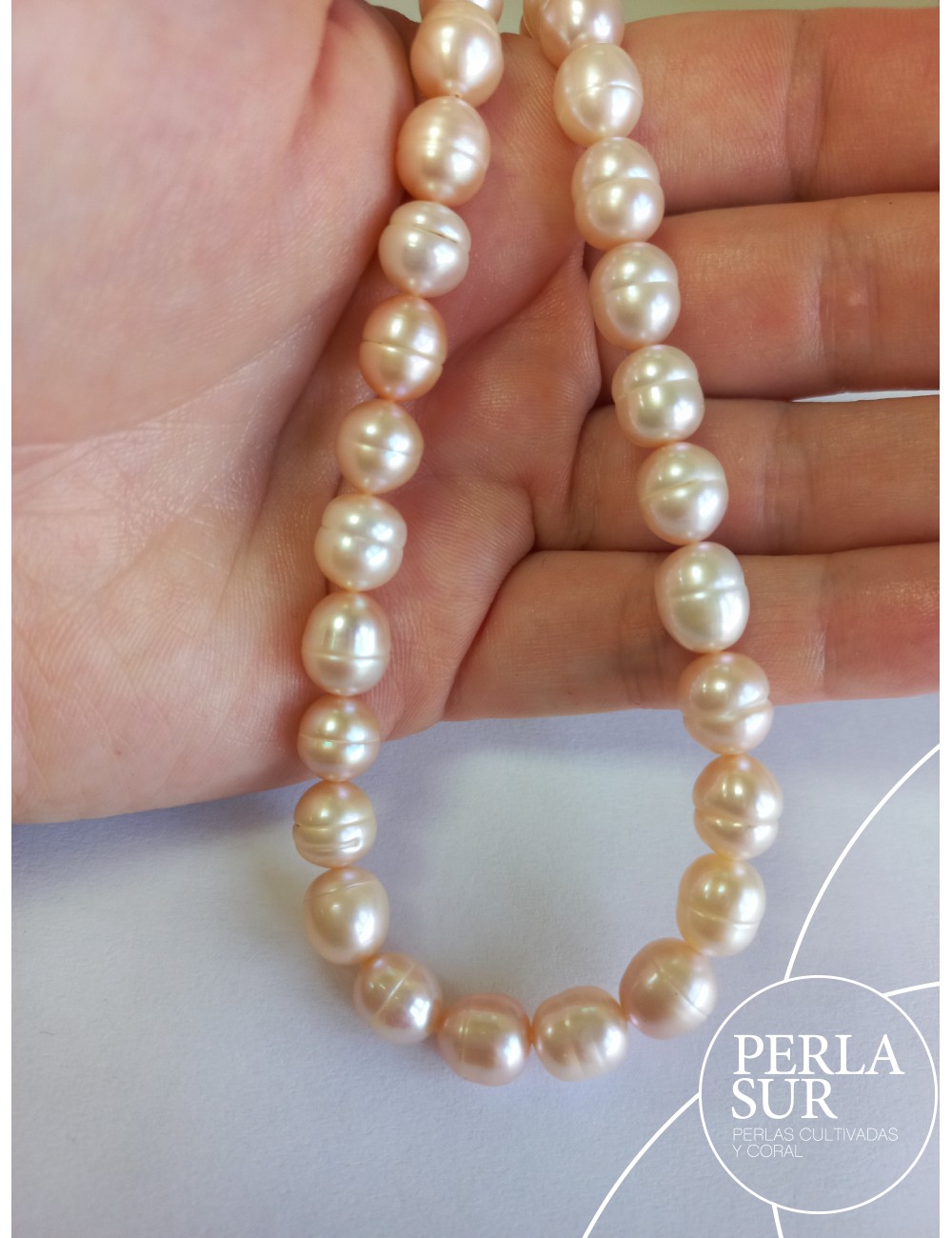 Hilo de perlas cultivadas de agua dulce color natural salmón o peach variado, forma barroca con cinturilla.