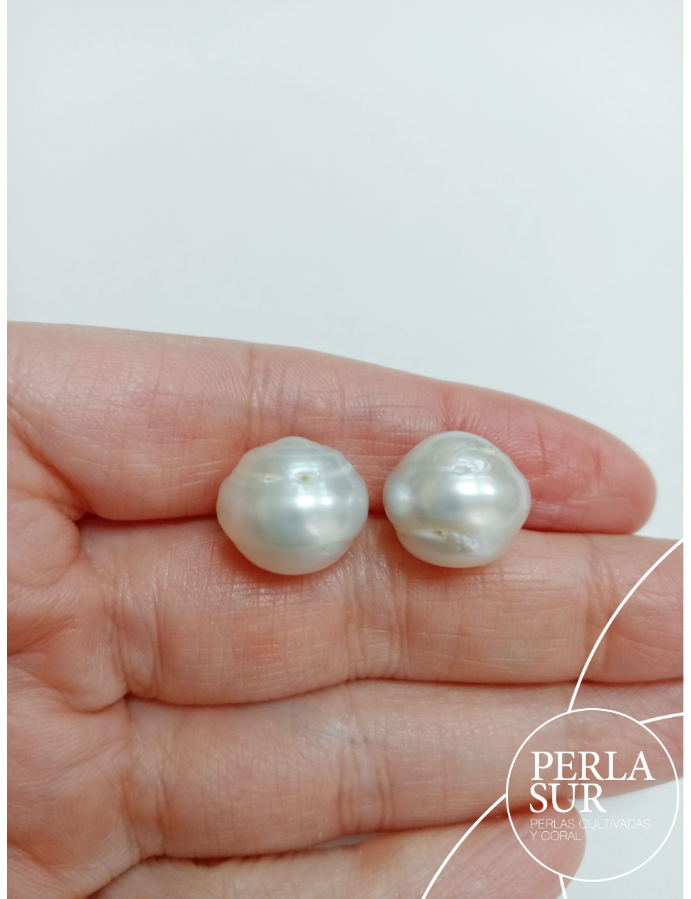 Pareja perla australiana casi redonda, con "cinturilla". Unos 14mm de diámetro.