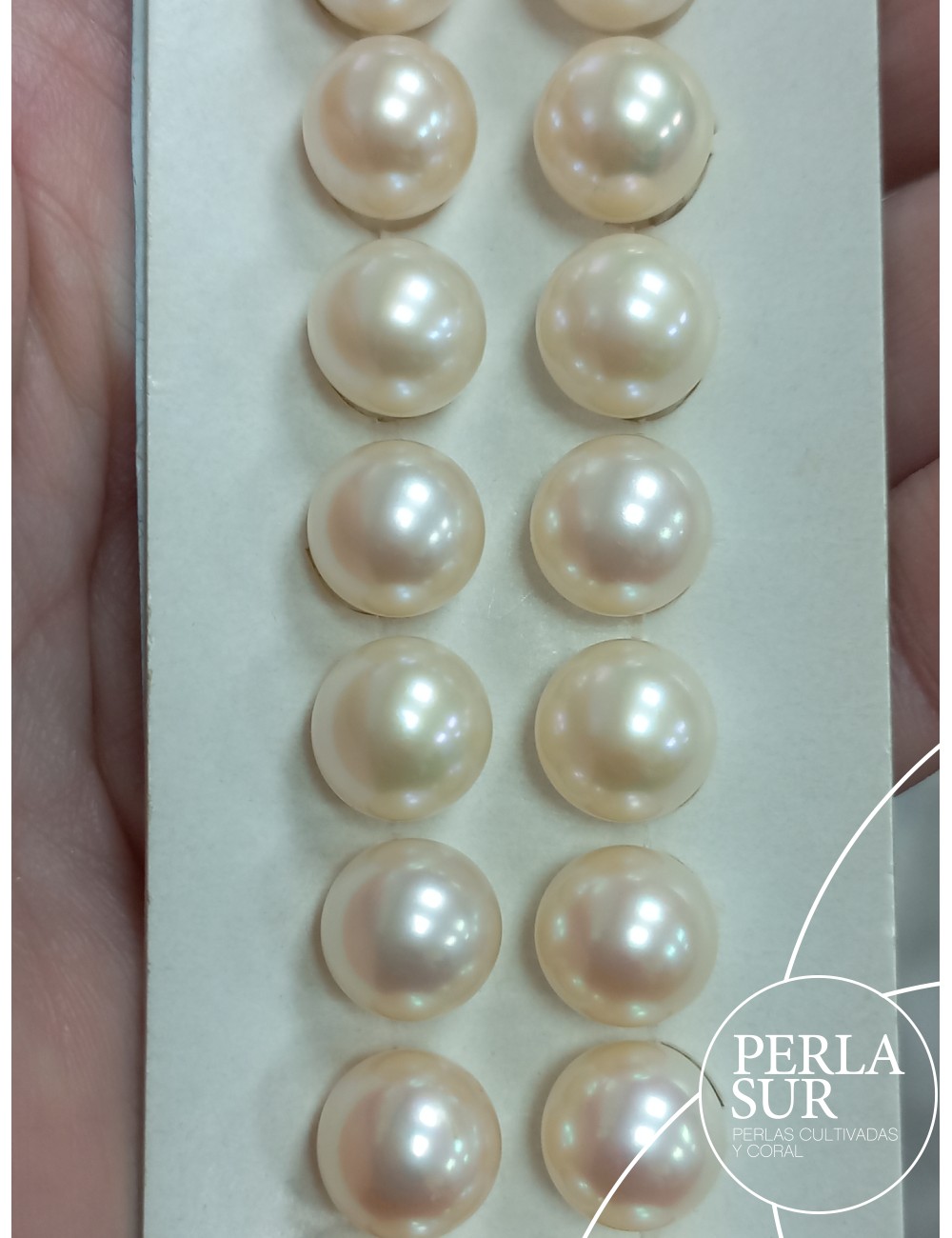Perlas cultivadas de agua dulce. Calidad B. Parejas de perla esférica con medio taladro. Tono blanco crema.