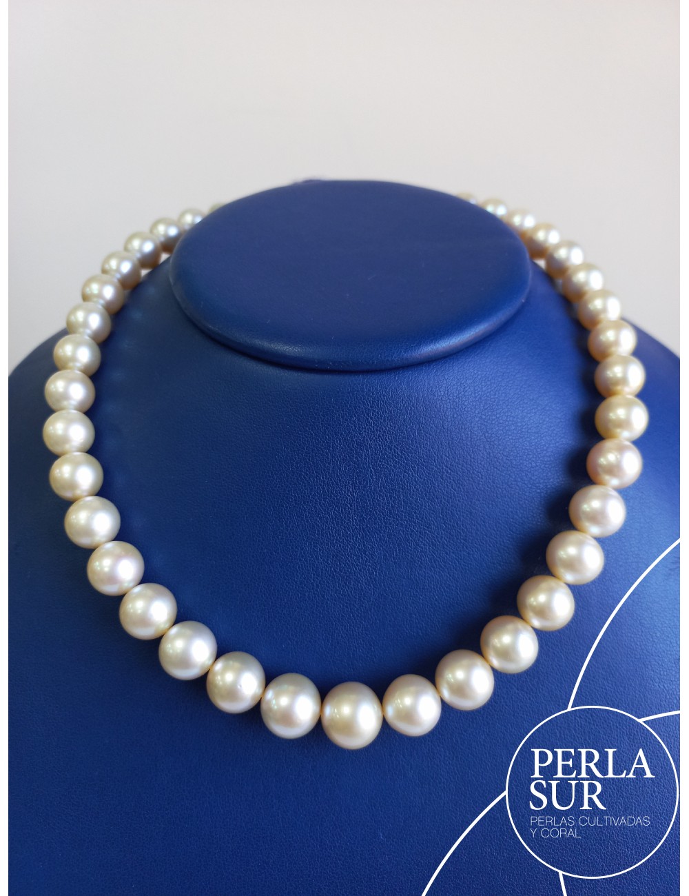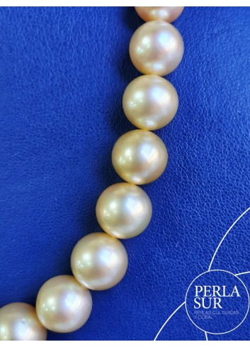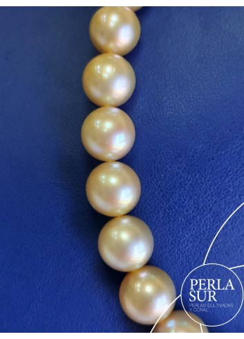 Hilo de Perlas redondas Australianas Golden en disminución 9 a 12 mm de diámetro. Está compuesto por 43 perlas y pesa 325,60k. Mide 43 cm de longitud. No incluye el cierre.