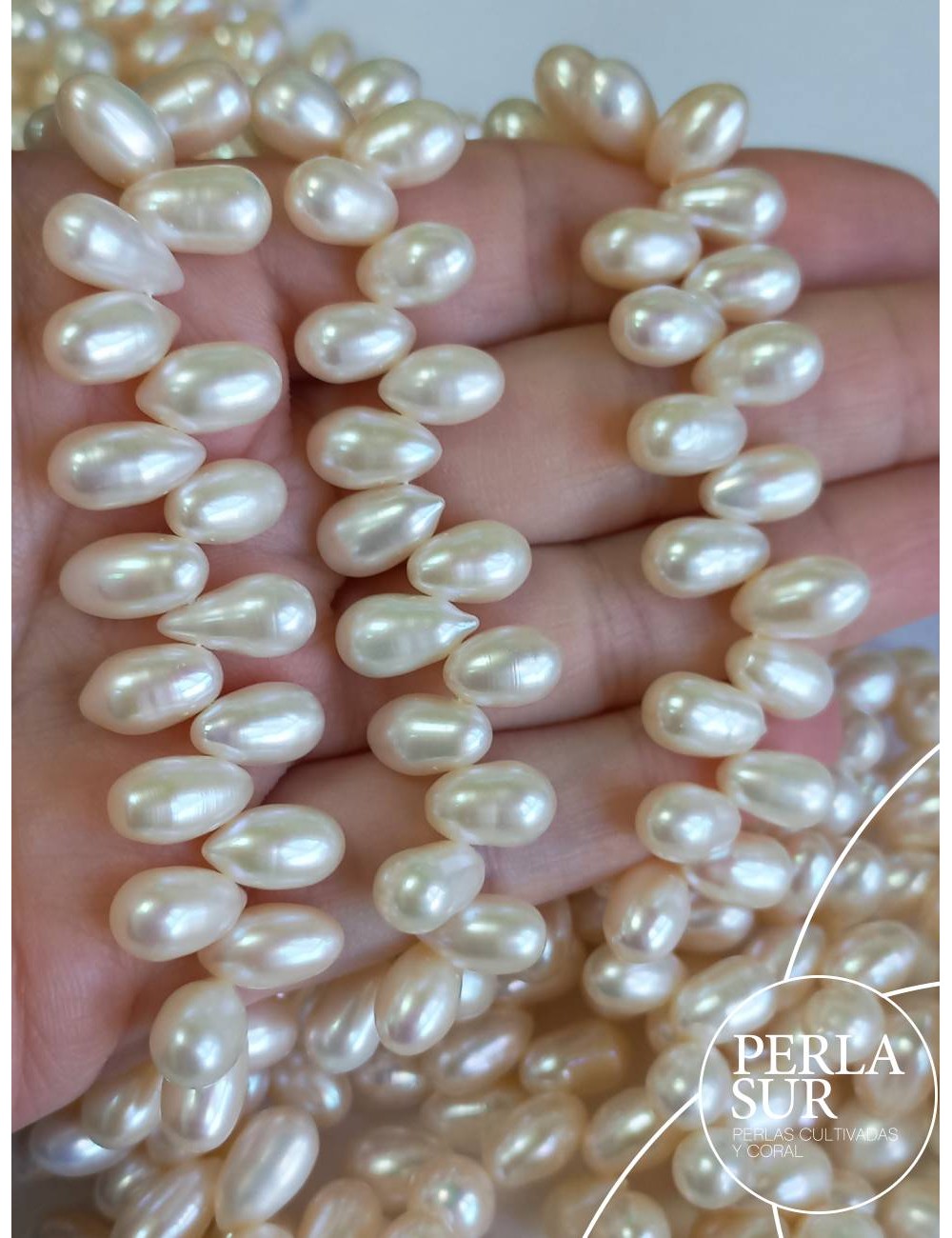 Las perlas varían levemente de forma a lo largo del hilo. En su mayoría son ovales, no aperilladas.