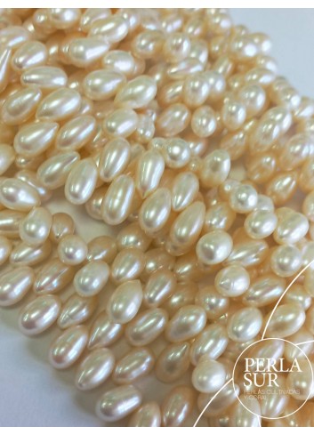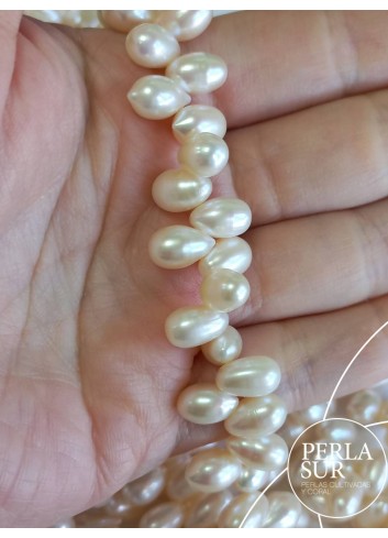 Hilo de perla cultivada de agua dulce de color blanco crema con forma oval-perilla.