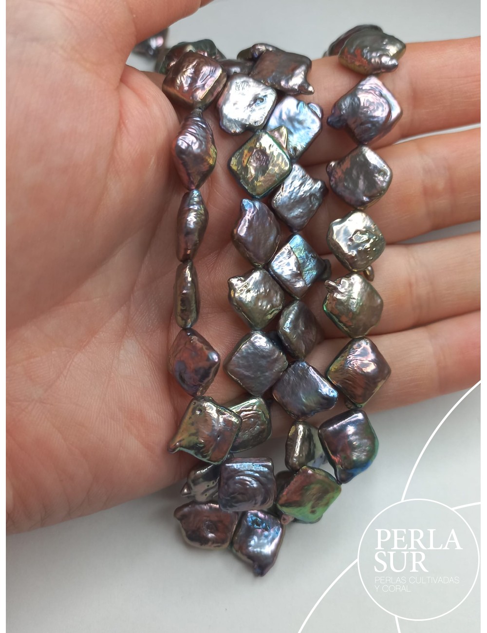 Hilo de perlas cultivadas de agua dulce Coin cuadrada 10mm de color peacock.