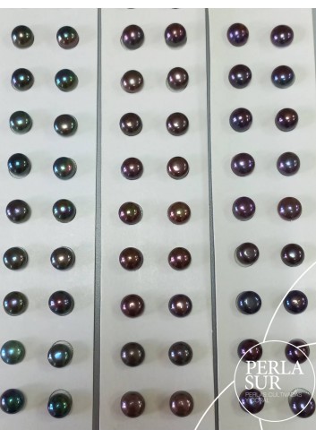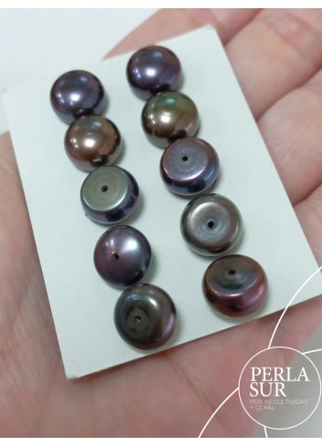 Pareja Perla Botón medio taladro 10-10´5mm tono verdes y rojos tornasolados.