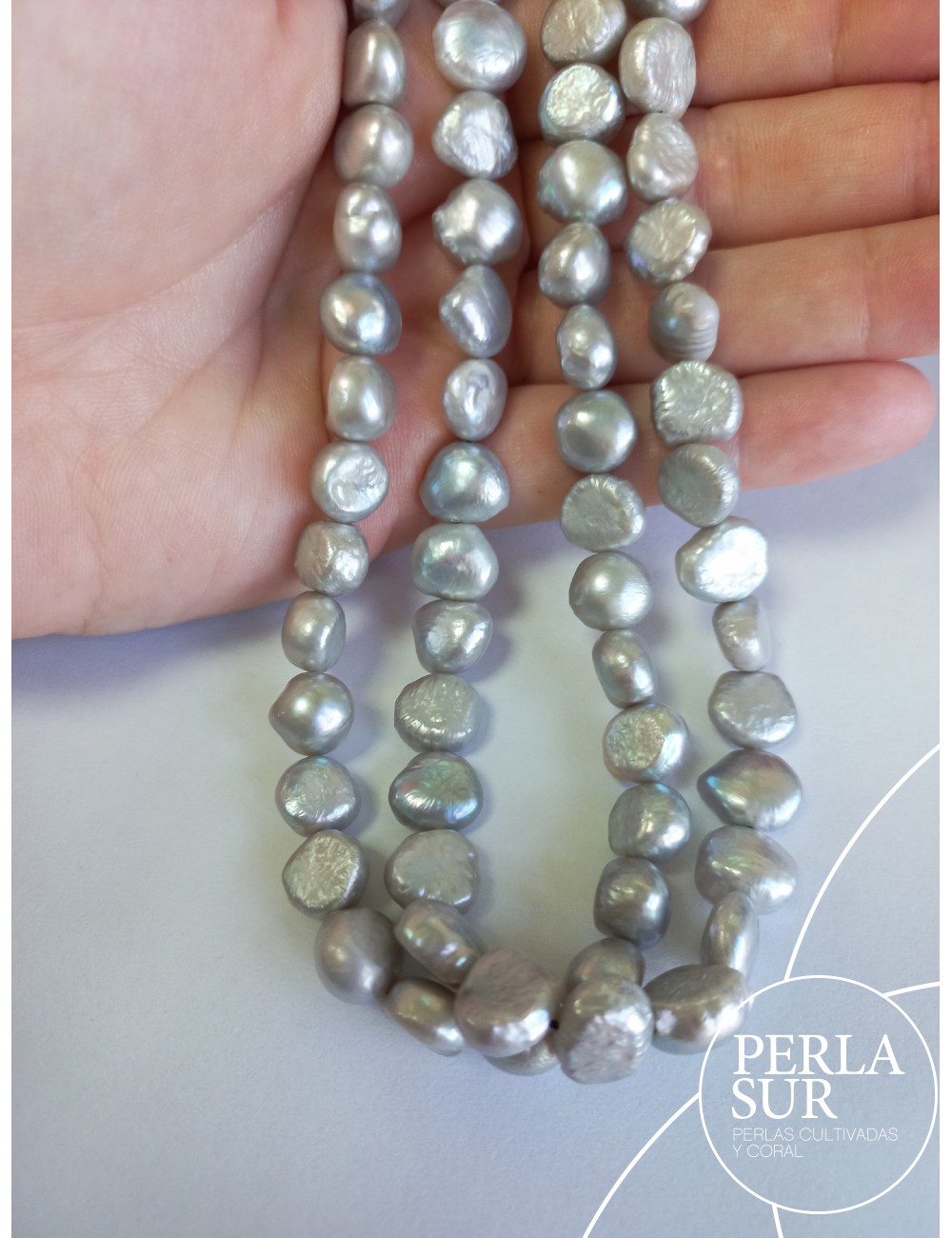 Hilo de perlas cultivadas de agua dulce barroca color gris plata.