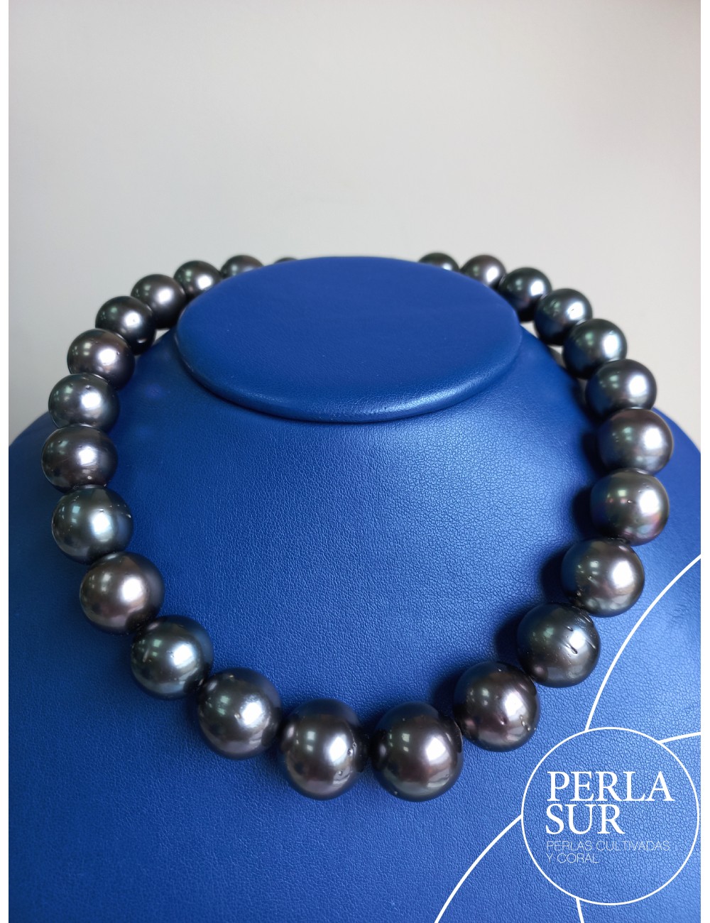Hilo de Perlas de Tahití Redondas. Perlas cultivadas en la ostra Pinctada Margaritifera. El hilo está compuesto por 26 perlas en ligera disminución, desde 15 a 17´50mm de diámetro. Mide 41cm de longitud. Cierre no incluido.