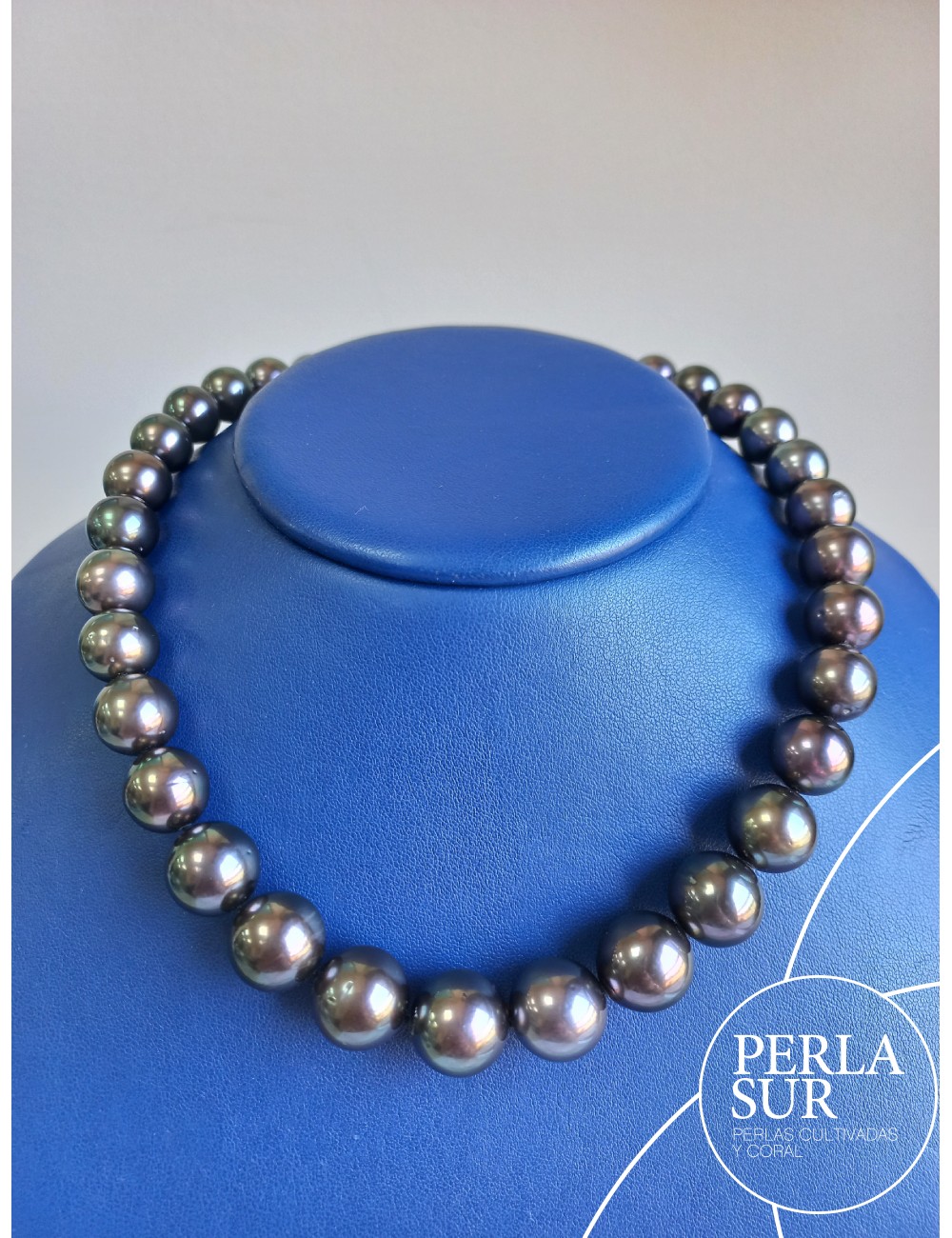 Hilo de Perlas de Tahití Redondas. Perlas cultivadas en la ostra Pinctada Margaritifera. El hilo está compuesto por 37 perlas en disminución, desde 10 a 14´60mm de diámetro. Mide 43´5cm de longitud. Cierre no incluido.