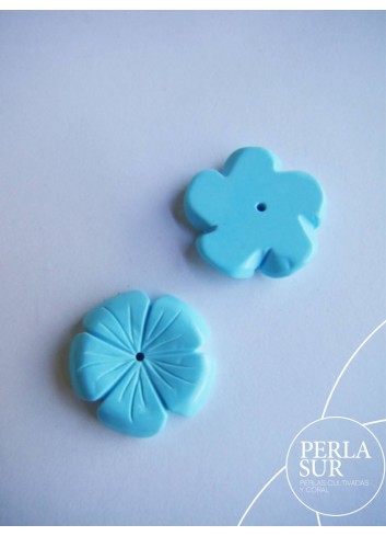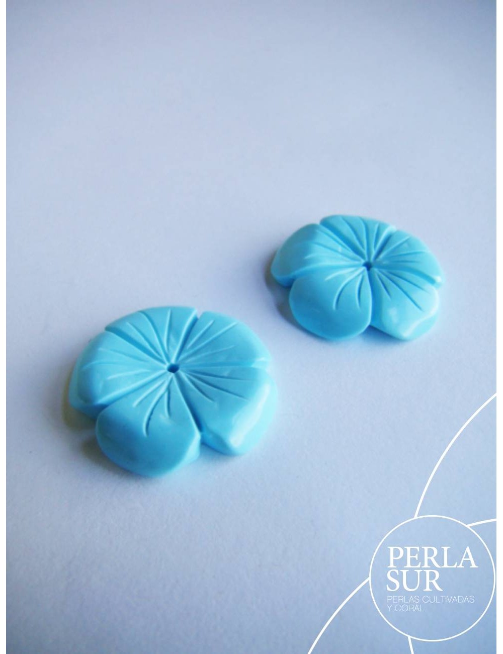 Pareja flor de 5 pétalos 15mm de turquesa reconstituida de alta calidad. No se deteriora el color. Precio por pareja. Posee un taladro en el centro.