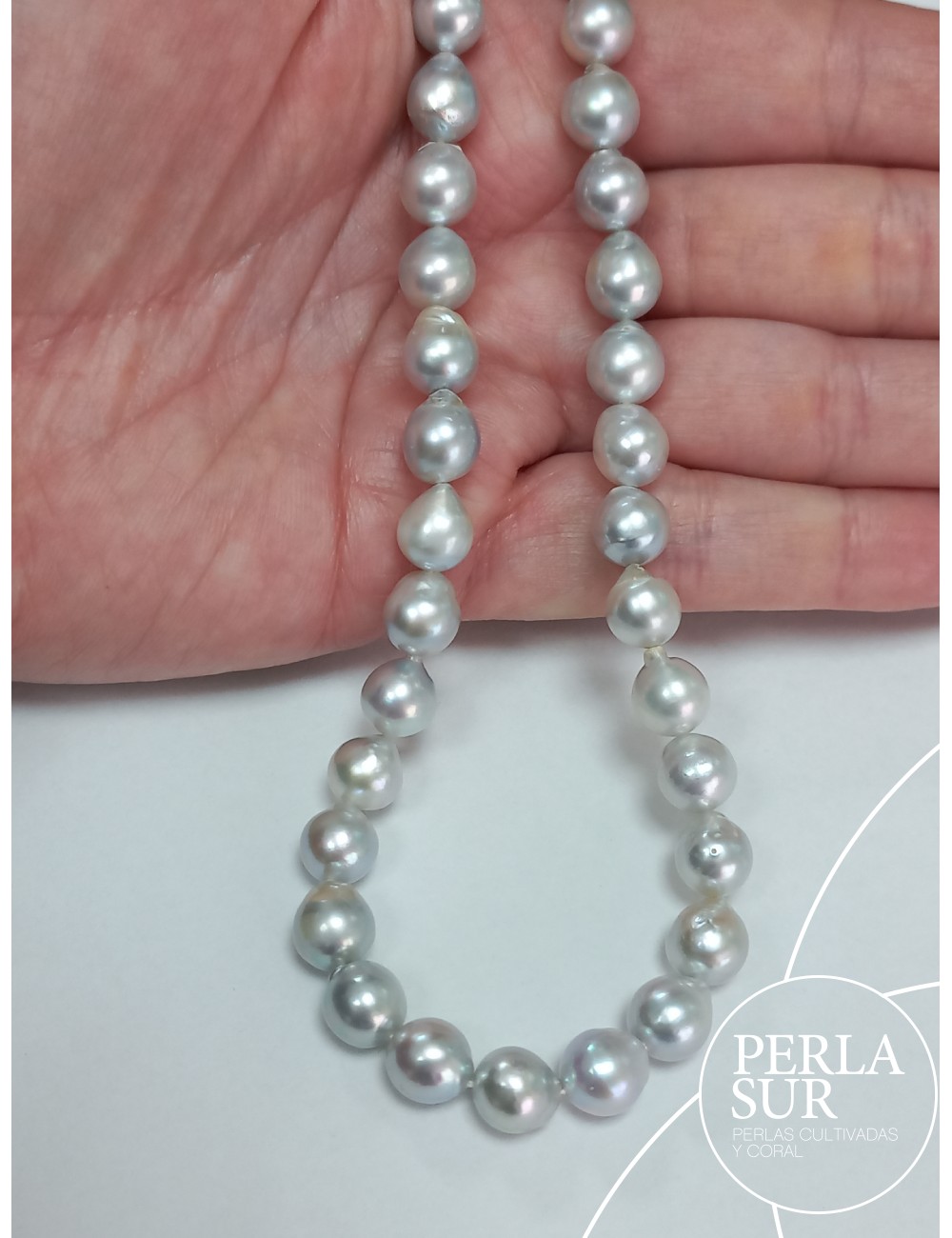 Semibaroque cultured Akoya pearl strand. Cultured in Pinctada Martensii oyster.