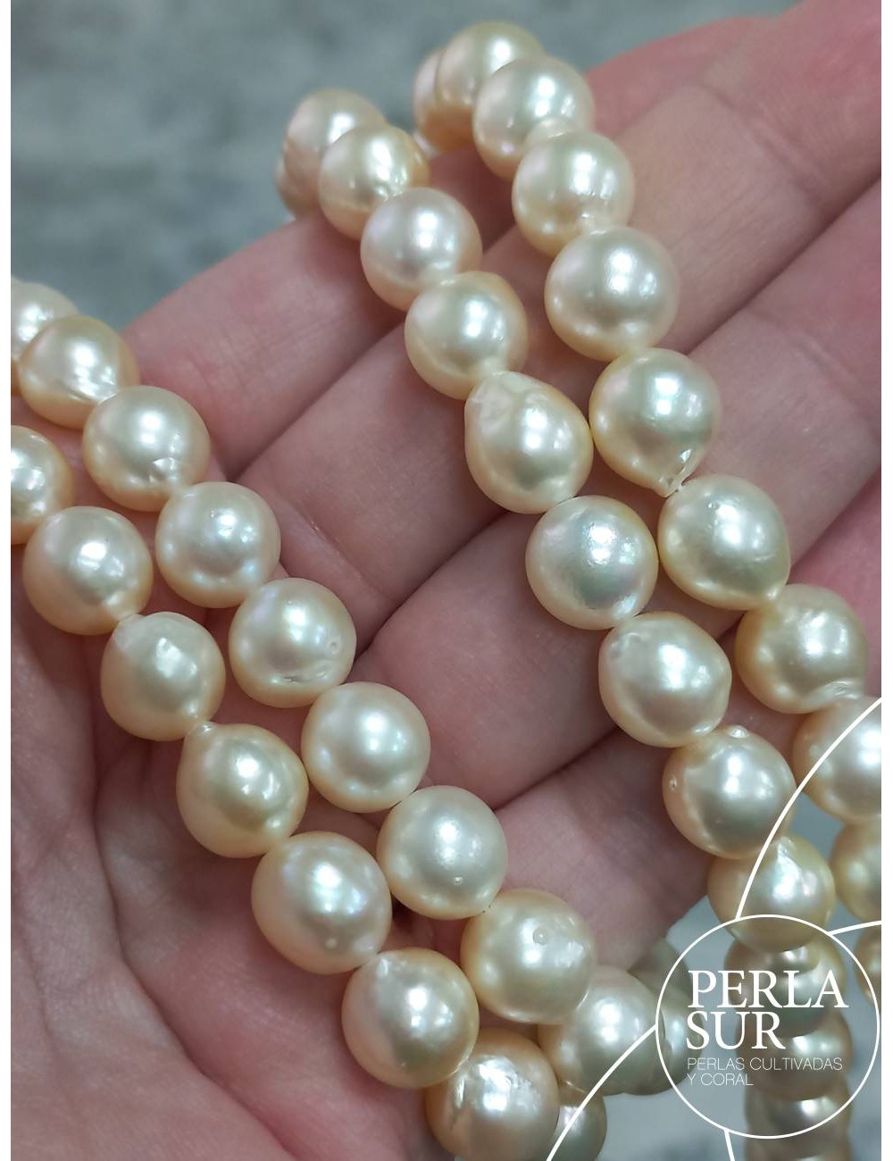 Round golden cultured Akoya pearl strand. Cultured in Pinctada Martensii oyster.