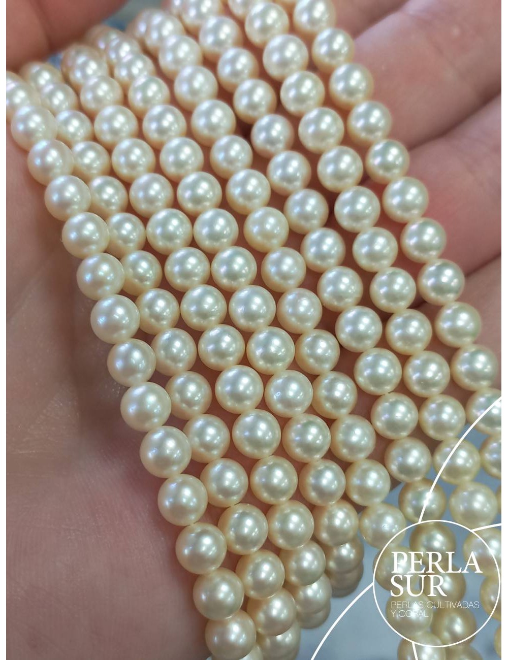 Round cultured Akoya pearl strand. Cultured in Pinctada Martensii oyster.
