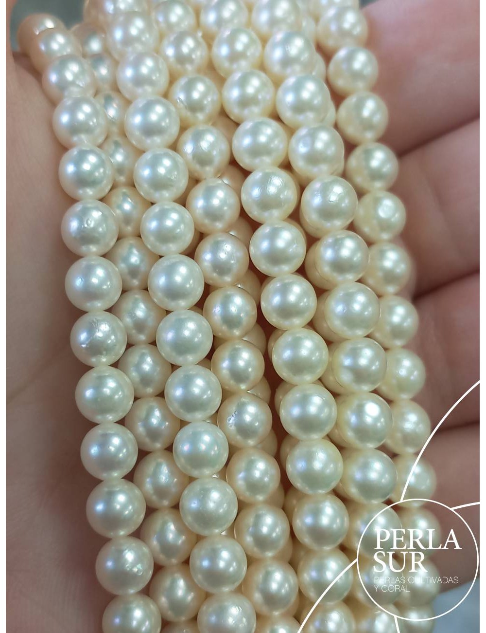 Round cultured Akoya pearl strand. Cultured in Pinctada Martensii oyster.