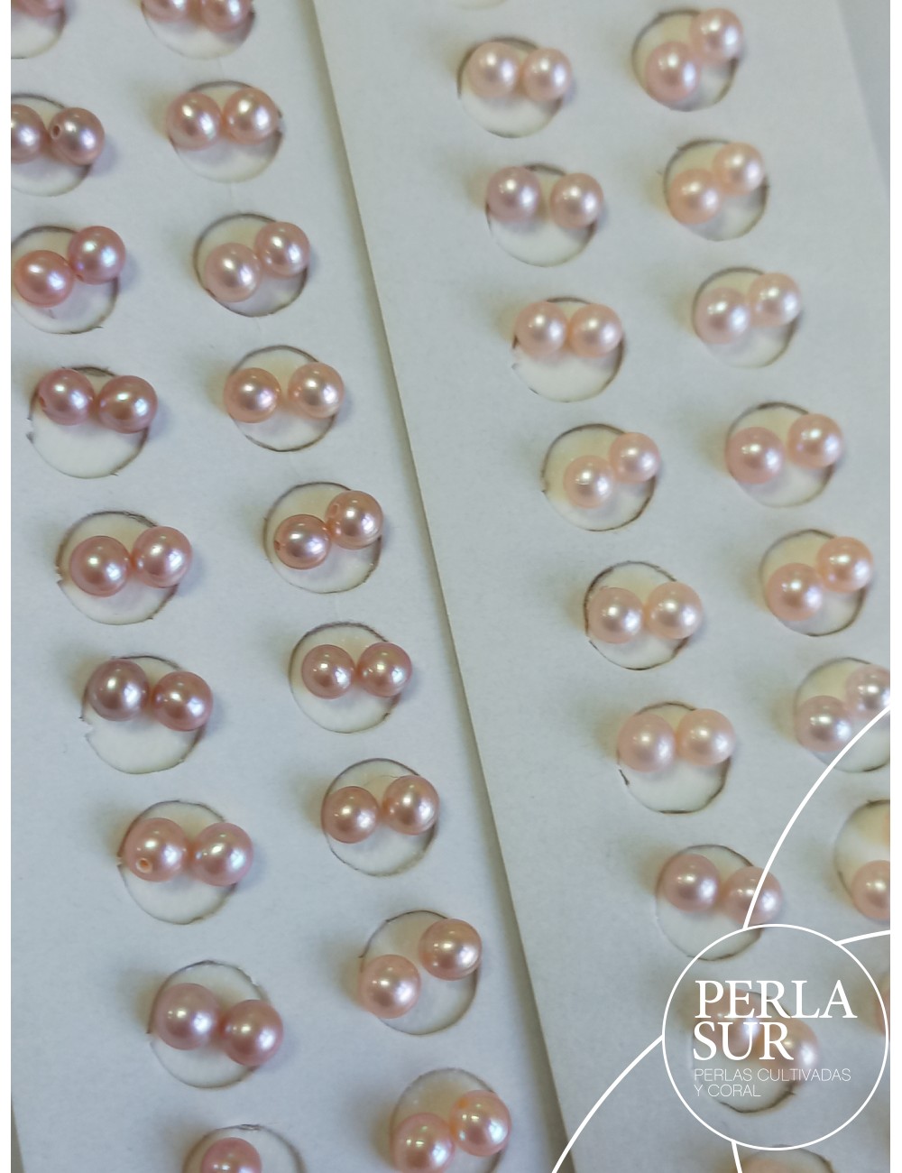 Round halfdrilled pair of natural color 4-4´5mm salmon and lilac. Freshwater cultured pearls. Price per pair.