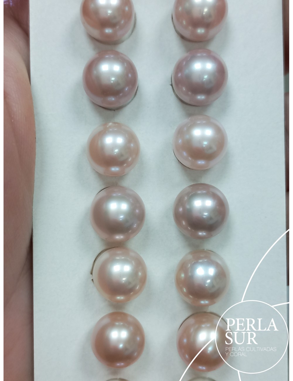 Round halfdrilled pair of natural color 9´5-10mm salmon and lilac. Freshwater cultured pearls. Price per pair.