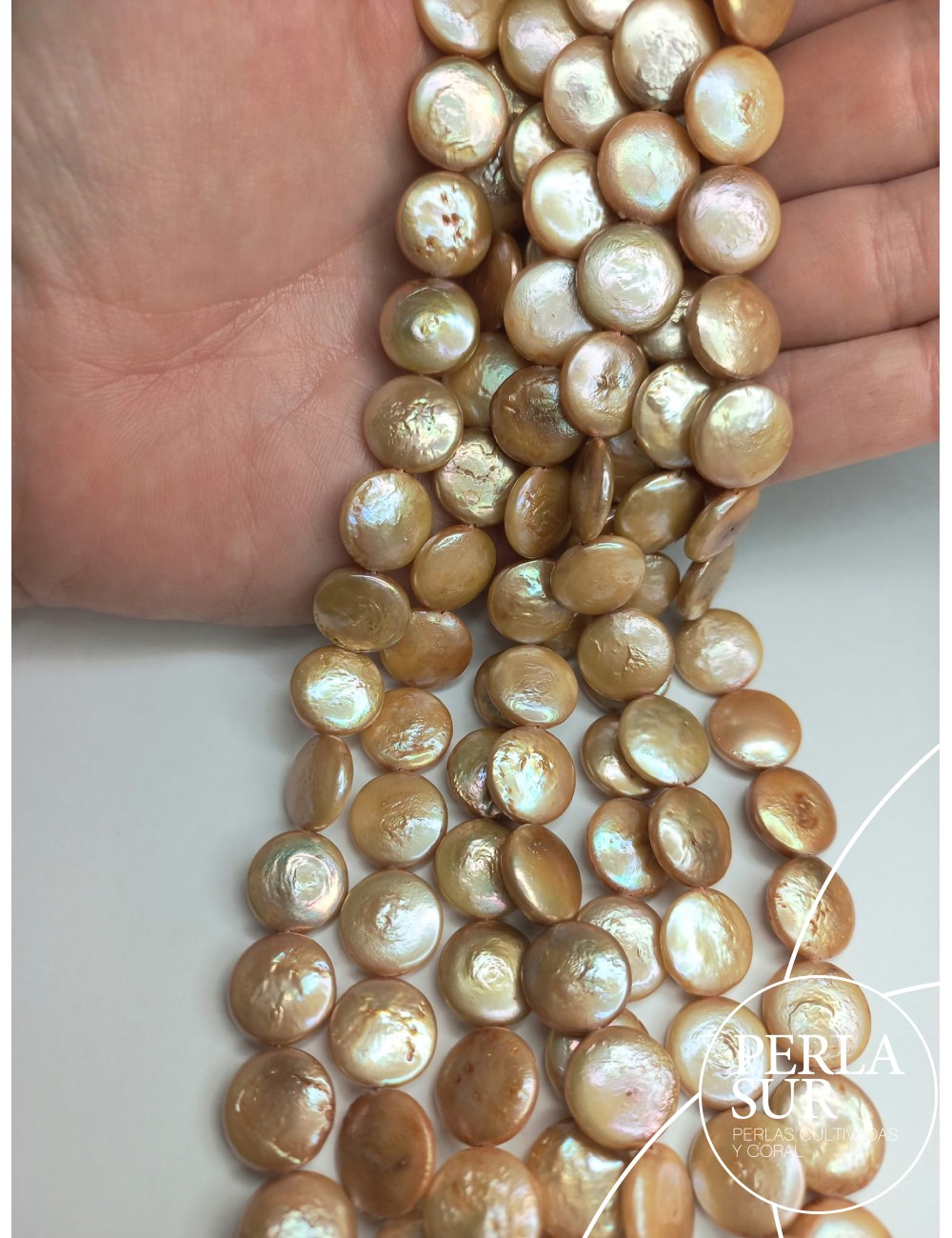 Coin Baroque Pearl Strand 12mm Golden. Freshwater cultured pearls. Length 40cm.