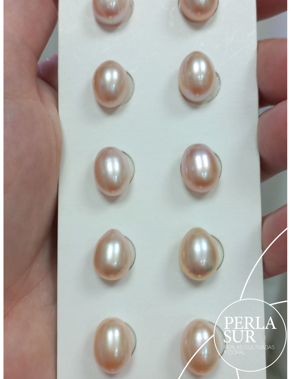 Pair Drop 9-9´5mmx12mm halfdrilled freshwater cultured pearls. Natural Salmon and Lilac Colour. Price per pair.