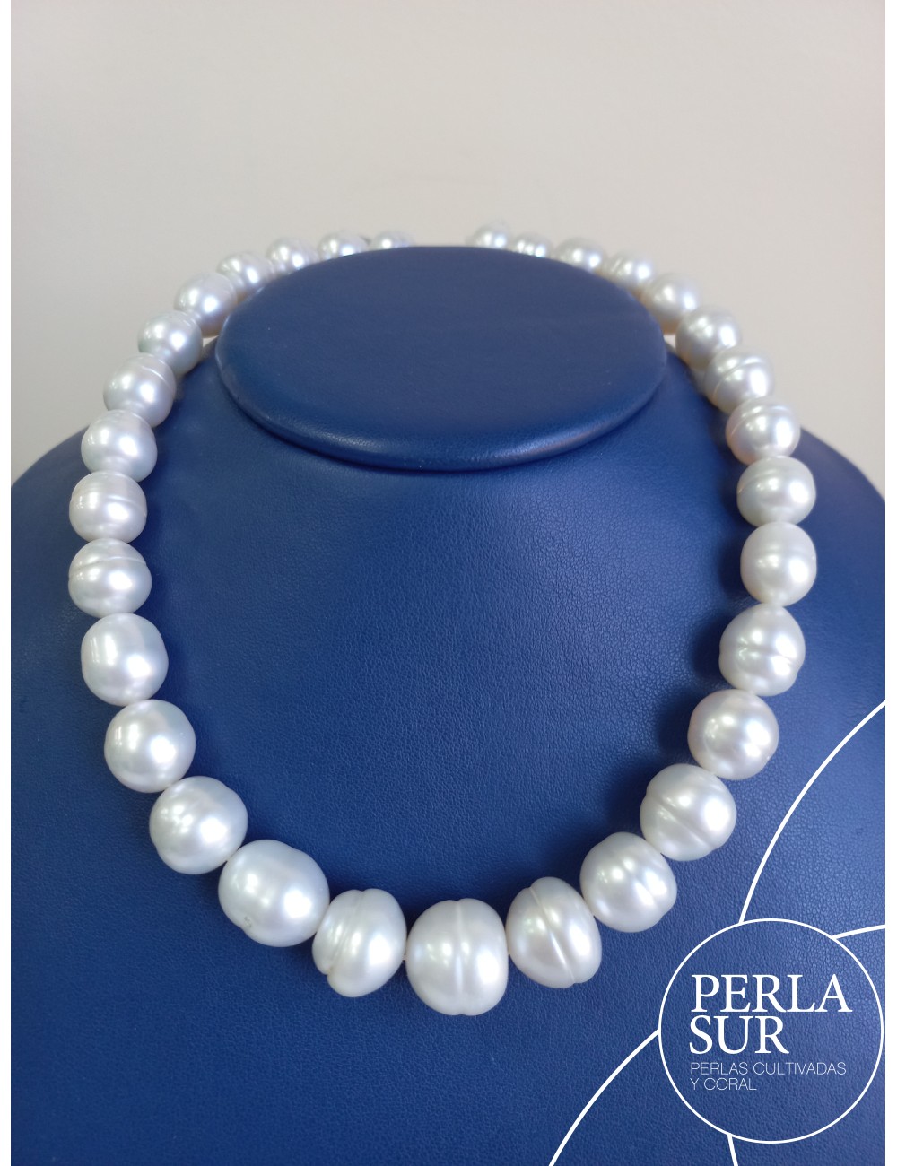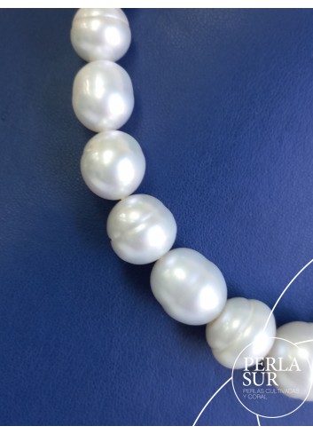 Collar Perla Australiana, forma semibarroca, con marcas circulares. Mide 11x16.4mm (en disminución), tiene 31 piezas y pesa 502.70kts. Tiene de longitud 42 cm. No incluye el cierre.